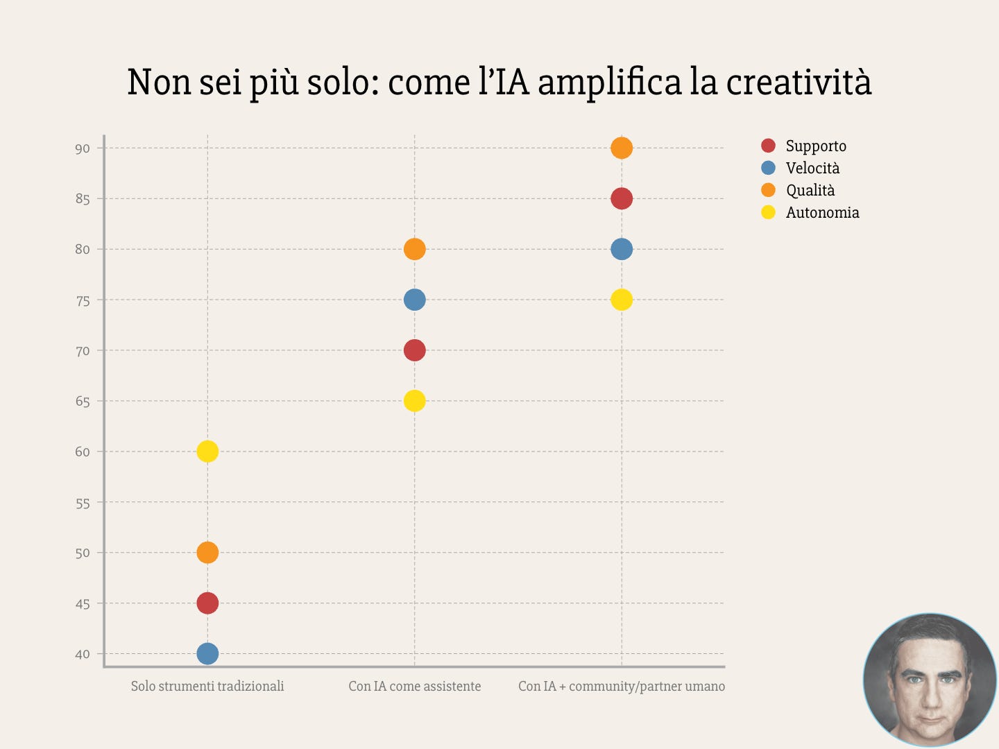 Ecco un grafico che mostra quanto cambia il senso di supporto velocità e qualità creativa quando si lavora con l’IA rispetto a farlo da soli .